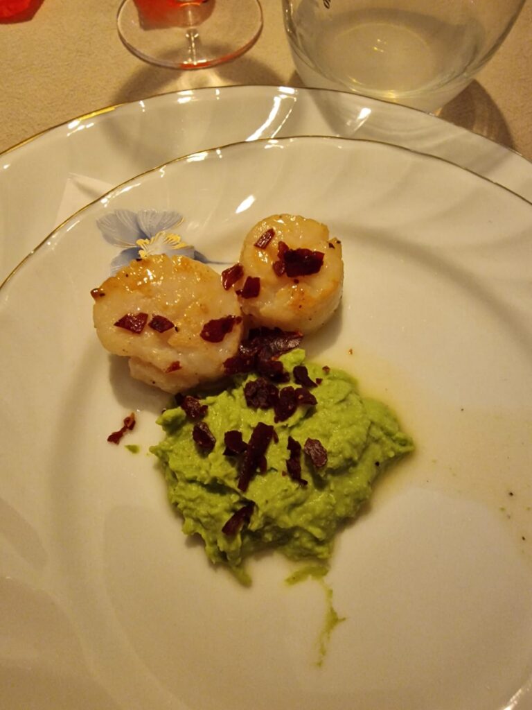 Als voorgerecht presenteerden we dan coquilles met erwtencrème en pancetta. We deden het eigenlijk zonder recept, maar het leek wel op de link in deze paragraaf. De pancetta vervingen we door ovengedroogde en verkruimelde parmaham.